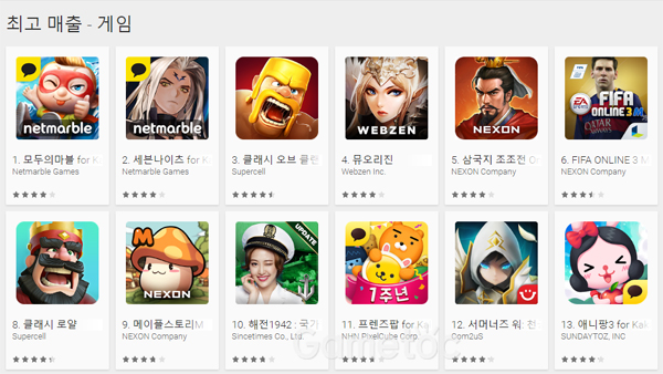 넷마블게임즈는 ‘모두의마블’, ‘세븐나이츠’로 2종, 슈퍼셀은 ‘클래시오브클랜’, ‘클래시로얄’ 2종이다.