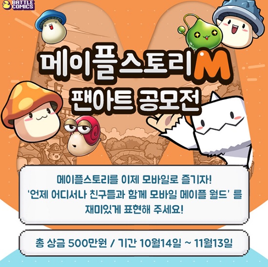 더웨일게임즈는 자사의 웹툰 플랫폼 배틀코믹스에서 모바일게임 ‘메이플스토리M’의 팬아트 공모전을 진행한다고 밝혔다.
