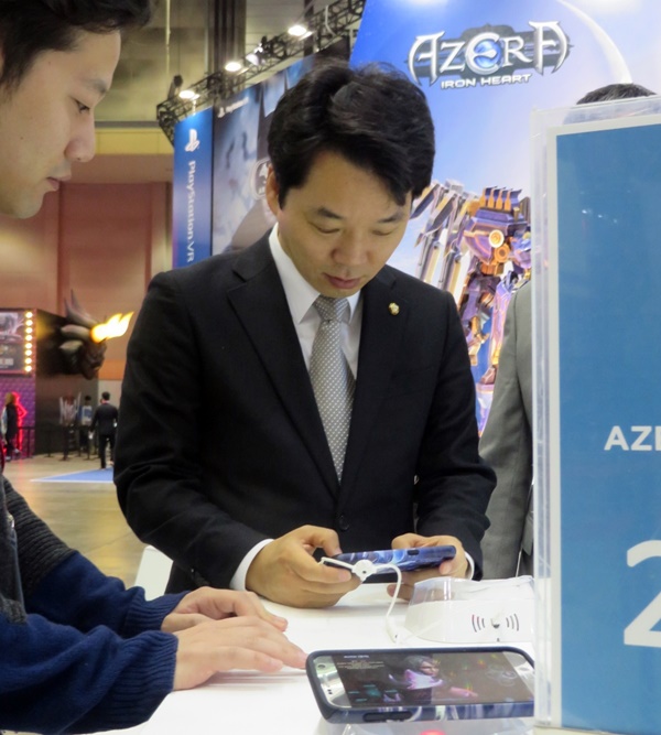 김 의원은 17일 오전 부산 벡스코에서 개막한 지스타 2016 B2C 전시회장을 방문해 웹젠 부스에 들러 모바일게임 ‘아제라: 아이언하트’를 시연했다. 김 의원은 웹젠 대표와 이사회 의장을 겸직했으며, 현재도 웹젠 최대주주다.