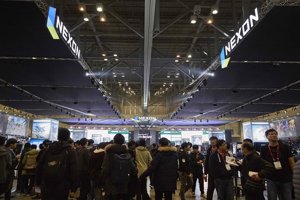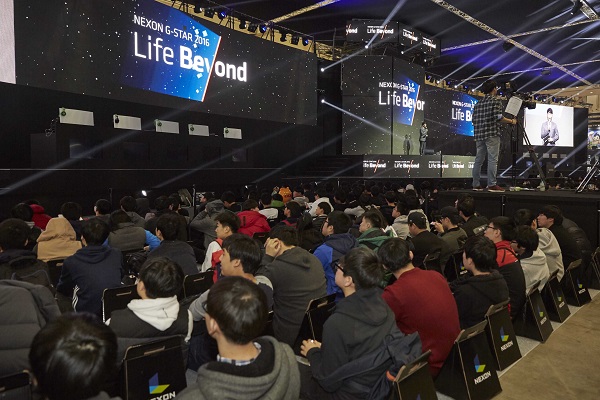 넥슨이 17일 개막한 게임쇼 지스타 2016에서 압도적인 규모를 뽐냈다. 관람객들이 벡스코 B2C관에 입장하는 순간 그야말로 ‘넥슨 월드’가 펼쳐진다.