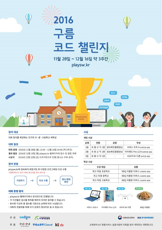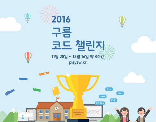 ‘2016 구름 코드 챌린지’는 전국의 초·중·고 학생을 대상으로 한 온라인 코딩 대회로, 내달 19일까지 3주간 한국정보화진흥원이 운영하는 코딩 교육 사이트 ‘디지털 스쿨백팩’을 통해 진행된다. 이번 대회의 코딩 미션에는 블록 프로그래밍, 알고리즘, 로보 코드, GUI, 텍스트 코딩 등 10여 개 이상의 다양한 문제가 출제됐다. 참여 학생은 대회 기간 중 원하는 시간에 자유롭게 접속하여, 주어진 미션을 수행하면 된다.