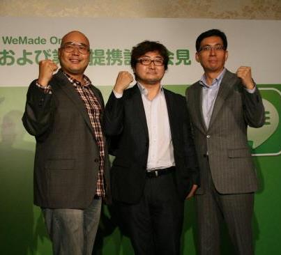 위메이드 모바일 게임 ‘카오스&디펜스’와 ‘라인’과 서비스 계약 발표 현장. 일본 팰리스호텔에서는 남궁훈 위메이드 대표와 모리카와 NHN재팬 대표와 함께 최종구 위메이드 온라인 대표가 참석했다.