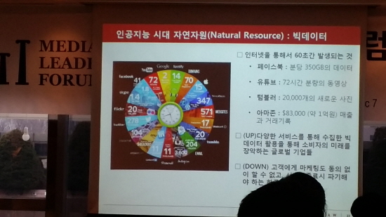 그는 “인공지능 시대의 자연자원이 빅데이터다. 페이스북 분당 350GB의 데이터, 유튜브 72시간 분량의 동영상, 텀블러 2만개 사진, 약 1억 매출이 인터넷으로 60초간에 일어난다”며 “수집한 빅데이터 활용은 소비자의 미래를 장악한다. 그런데도 한국은 고객에게 동의없으면 마케팅도 할 수 없고 서비스 종료시 파기해야 한다”고 말했다.
