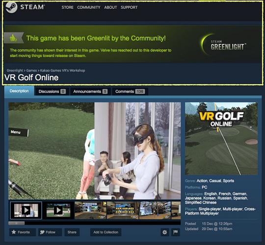 카카오게임즈(각자대표 남궁훈, 조계현)가 서비스하는 VR(가상현실) 골프 게임 ‘VR골프온라인(영문명 VR Golf Online)’이 스팀VR 그린라이트에 선정됐다.