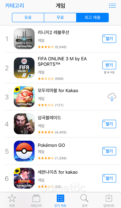 앱스토어 최고매출 순위에서 ‘포켓몬고’는 단번에 5위까지 올랐다. 현재 앱스토어 매출 1위는 ‘리니지2 레볼루션’이며, ‘피파온라인3 M’와 ‘모두의 마블’, ‘삼국 블레드’가 각각 2위부터 4위까지 차지하고 있다. 출시 첫날의 성적인 만큼 향후 순위가 더 오를 가능성도 있다.