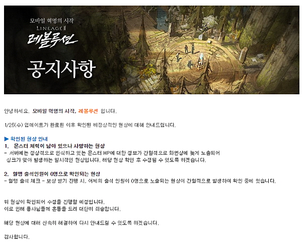 하지만 ‘리니지2 레볼루션’은 업데이트 이후 오류 코드 400이 뜨거나, 몬스터 체력이 남았는데 사망하고, 혈맹 출석인원이 0명으로 나타나는 등 오류 현상이 간헐적으로 발생했다.