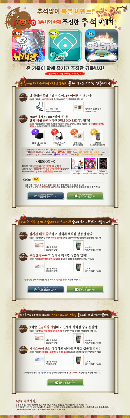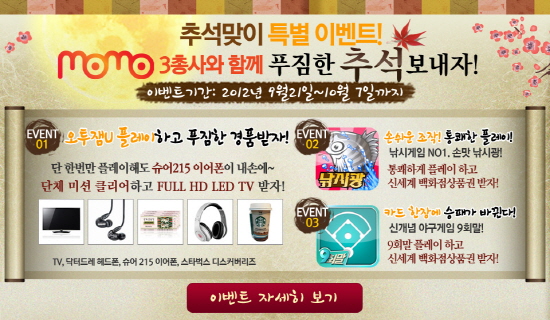음악전문게임사 ㈜모모(대표 강영훈, 이하 모모)가 다가오는 추석을 맞아, 오는 10월 7일(일)까지 온 가족이 함께 즐길 수 있는 ‘모모 삼총사와 함께하는 푸짐한 추석 보내기’ 프로모션을 진행한다.