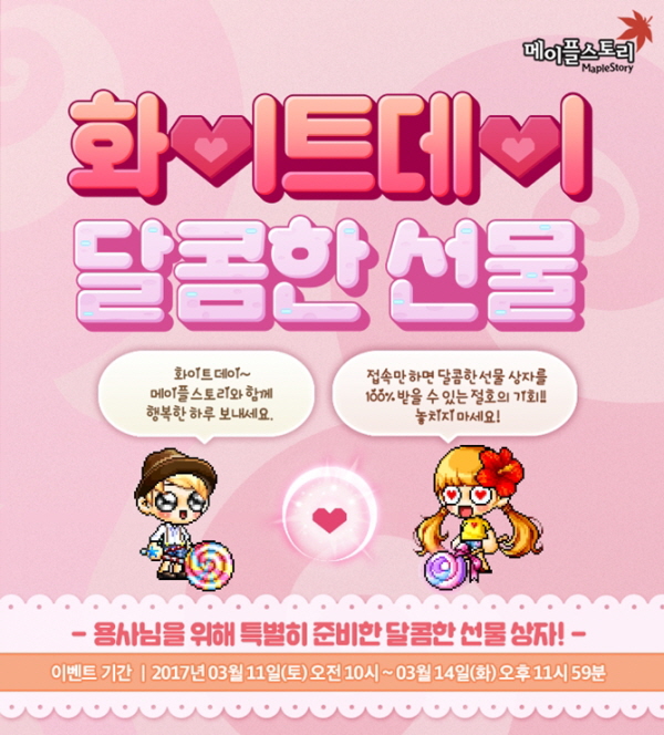 ‘메이플스토리’에서는 3월 11일부터 14일까지 게임에 접속하는 유저 대상으로 ‘달달한 선택형 데미지 스킨 상자’, ‘캔디는 달콤해! 훈장’, ‘성향 성장의 비약’ 등 풍성한 혜택이 포함된 ‘달콤한 선물 상자’를 제공한다.