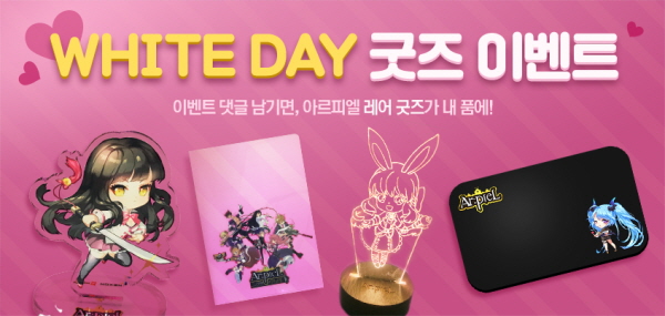 ‘아르피엘’에서는 오는 14일까지 전체 유저를 대상으로 '화이트 데이 사탕(10개)'을 지급하고, 공식 홈페이지에 '아르피엘 굿즈'가 필요한 사연을 댓글로 남기면 추첨을 통해 20명에게 '입체조명', '장패드', '아크릴 스탠드' 등 현물 상품을 선물한다.