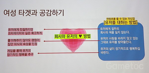 특히 유저를 대할 때 연애하듯 잘하되 회사의 색을 잃지 않는 것이 중요하다고 강조했다. 마치 유저와 연애를 한다고 생각하자며, 있는 그대로 유저를 받아들이고 유저의 삶이 장기적으로 행복해지길 바라자는 것이다.