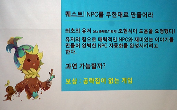 한편 질의응답 시간에는 ‘페리아연대기’의 출시일정에 대한 질문이 쏟아졌다. 조씨는 “열심히 개발중이며, 연말에는 유저 대상 테스트를 진행할 수 있도록 최선을 다하고 있다”고 조심스레 답했다. 또한 그는 “내년에는 게임을 반드시 출시했으면 좋겠다”며 “내년 NDC에는 아트 담당이나 프로그래머가 포스트모템 강연을 할 수 있기를 간절히 바란다”고 덧붙였다.