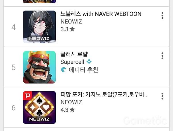 또 네오위즈의 모바일 웹보드게임 ‘피망포커:카지노로얄’도 선전중이다. '피망포커'는 지난 4월 모바일 웹보드게임 결제한도가 50만 원으로 상향되자 동종의 장르 중 가장 높은 매출을 기록하고 있다. 3일 기준 월초 효과까지 겹쳐 구글플레이 최고 매출 6위에 올랐다.