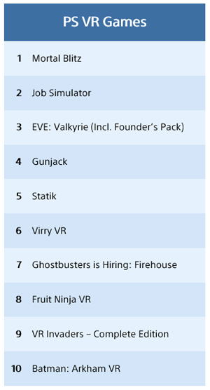 소니에 따르면 4월 PS VR 타이틀 1위는 ‘모탈 블리츠’이며, 다양한 직업을 체험해 볼 수 있는 ‘잡 시뮬레이터(Job Simulator)’가 2위, 슈팅 게임 ‘이브: 발키리(EVE: Valkyrie)’가 3위에 올랐다.