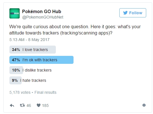 포켓몬고허브의 자체 설문조사에 따르면 81% 가량의 북미 유저가 추적 프로그램에 우호적인 반응을 보였다. 조사에 참여한 5178명 중 34%가 ‘추적 프로그램(트래커)을 좋아한다’고 밝혔으며, 47%가 ‘추적 프로그램을 사용해도 괜찮다’고 응답했다.