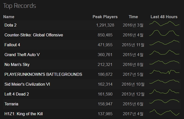 ‘배틀그라운드’의 인기는 동시접속자 지표에서 더 두드러진다. 스팀 유저들의 게임 사용량을 분석하는 스팀차트에 따르면 ‘배틀그라운드’는 5월 기준으로 최고 동시접속자 18만6672명을 기록하며 역대 6위를 기록했다. 1위는 ‘도타2’, 2위는 ‘카운터스트라이크: 글로벌오펜시브’, 7위는 ‘문명7’이다. 개인방송 플랫폼 트위치에서도 ‘하스스톤’, ‘리그오브레전드’와 함께 시청자수 최상위권을 다투고 있다.