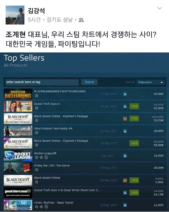 ‘검은사막’은 출시 하루만에 스팀 게임 전체 부문 Top셀러 3위에 올랐다. 이를 본 김강석 블루홀 대표가 조계현 카카오게임즈 대표에게 “우리 스팀 차트에서 경쟁하는 사이냐”며 “대한민국 게임들 파이팅”이라는 축하 인사말을 페이스북을 통해 전하기도 했다.