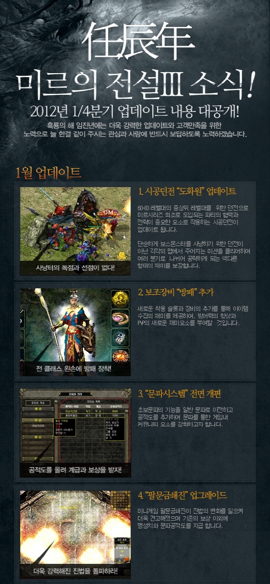 위메이드 엔터테인먼트(대표 박관호)가 무협 MMORPG ‘미르의 전설3’의 2012 1분기 대규모 업데이트를 4일, 사전 공개했다. 흑룡의 해의 대변혁을 예고한 것.
