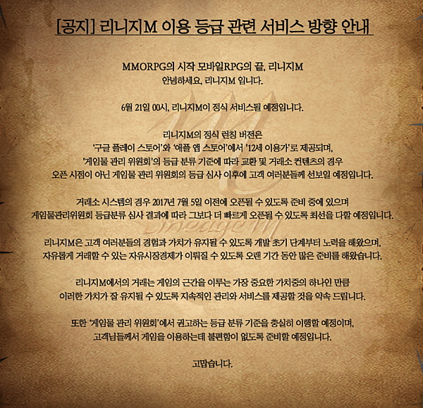 ‘리니지M’은 구글플레이와 애플 앱스토어에 ‘12세 이용가’로 20일부터 사전 다운로드, 21일 자정부터 정식 서비스를 시작한다. 하지만 게임위는 지난 5월 19일부터 모바일게임 내 유료 재화를 사용한 거래소 콘텐츠를 ‘청소년이용불가’ 등급으로 분류했다. 청소년유해매체물을 모방해 사행성을 조장한다는 이유에서다.