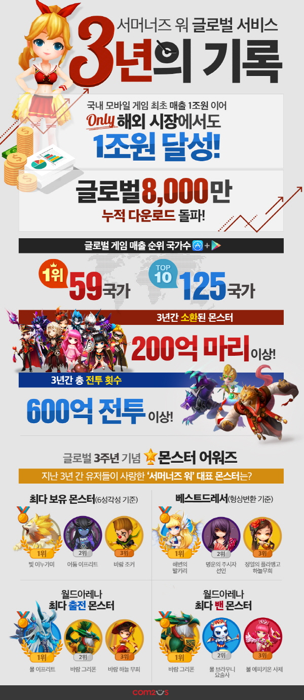컴투스는 ‘서머너즈워’의 글로벌 서비스 3주년 인포그래픽을 통해 지난 3년간 전세계 시장에서 거둔 게임 성과를 공개했다. 이에 따르면 올해 초 총매출 1조원을 기록한 ‘서머너즈워’는 최근 국내를 제외한 해외 시장에서만 1조원의 매출을 달성했다. 이는 한국 모바일게임 사상 최초이며, 국내의 모든 게임을 통틀어도 최단 기간 달성 기록이다.