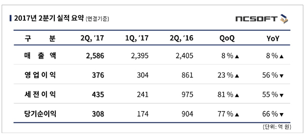 엔씨소프트(대표 김택진)가 2017년 2분기 실적(연결기준)으로 매출 2586억 원, 영업이익 376억 원, 당기순이익 308억 원을 기록했다.