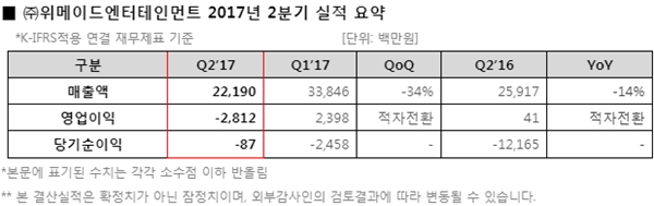 위메이드엔터테인먼트(대표 장현국)는 2017년 2분기 실적에 대해 국제회계기준(K-IFRS) 적용 연결 재무제표 기준 2분기 매출액이 약 222억원, 영업손실은 약 28억원을 기록했다고 9일 밝혔다.