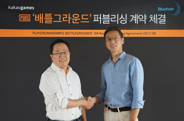 카카오게임즈(각자대표 남궁훈, 조계현)는 14일 블루홀과 ‘배틀그라운드’의 한국 퍼블리싱 계약을 체결했다고 밝혔다. ‘배틀그라운드’는 고립된 섬에 떨어진 100명의 이용자가 최후의 1인이 살아남을 때까지 생존 싸움을 벌이는 일명 ‘배틀로얄’ 게임이다. 지난 3월 글로벌 PC게임 플랫폼 ‘스팀(Steam)’을 통해 유료 테스트 버전(Early Acces, 얼리억세스)으로 먼저 출시된 이후, 완성도를 가다듬으며 막바지 개발 중이다.