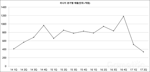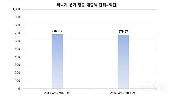 ‘리니지’ 연간 분기 평균 매출액은 2012년 500억 원을 돌파한 이래, 2014년을 제외하고 꾸준히 성장했다. 특히 2016년은 총매출액 3753억 원, 분기 평균 938억 원 등 역대 최대 실적을 기록했다. 하지만 2017년 2분기까지 총매출액 852억 원, 분기 평균 426억 원으로 대폭 하락한 것처럼 보인다.