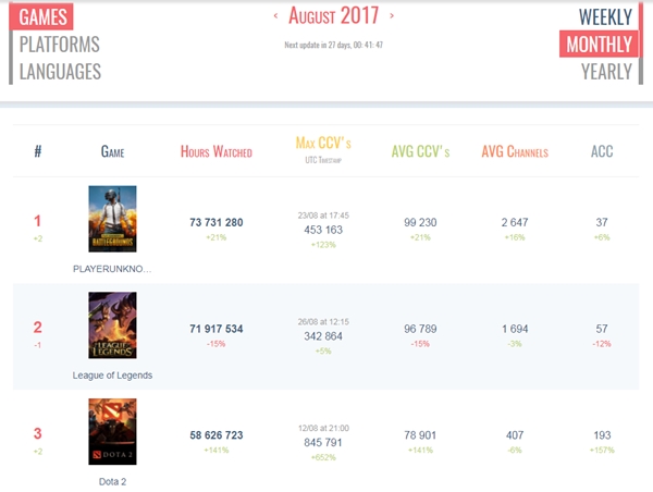 가모로코는 “트위치 데이터를 모니터링한 2014년 이래로 리그오브레전드가 월간 시청 시간에서 1위를 뺏긴 것은 이번이 처음”이라며 “배틀그라운드가 리그오브레전드를 폐위시켰다”고 전했다.