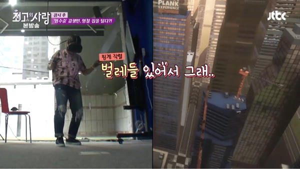 “발이 안떨어진다”며 조심스럽게 초고층 빌딩 위를 걷던 윤정수를 본 김숙은 등을 밀어버렸고, 윤정수는 빌딩에서 추락하면서 외마디 비명을 질렀다. 곧이어 VR게임 체험에 나선 김숙도 윤정수의 복수에 바닥에 나동그라졌다.