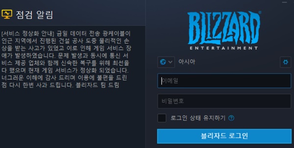접속 장애는 오후 3시경이 되어야 복구됐다. 블리자드는 공지를 통해 “데이터 전송 광케이블이 인근 지역에서 진행된 건설 공사 도중 물리적인 손상을 받는 사고가 있었고, 이로 인해 게임 서비스 장애가 발생했다”며 “문제 발생과 동시에 통신 서비스 제공 업체와 함께 신속한 복구를 위해 최선을 다했으며, 현재 게임 서비스가 정상화됐다”고 밝혔다.