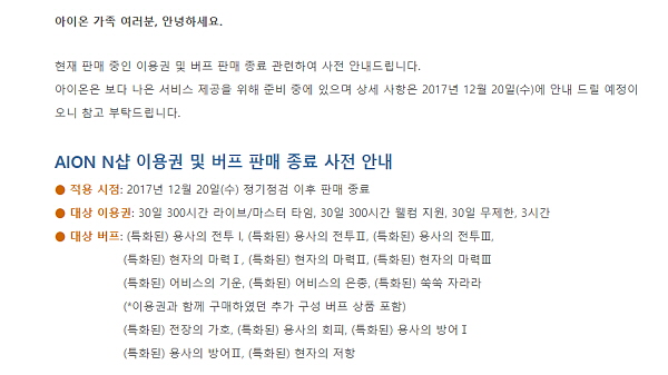 엔씨소프트 관계자는 “아이온 이용권 및 버프 판매 종료에 대한 자세한 정보는 20일 홈페이지를 통해 안내할 예정이다”고 말을 아꼈다.