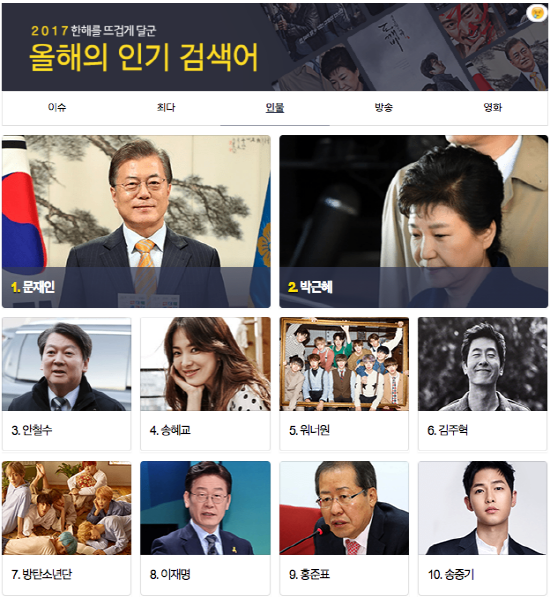 가장 많이 검색한 ‘인물’로는 정치인과 연예인이 상위 10위권을 모두 차지했다. 1위는 문재인 대통령으로 나타났다. 박근혜 전 대통령이 2위, 안철수 국민의당 대표가 3위로 파악됐다. 이 밖에도 이재명 성남시장이 8위, 홍준표 자유한국당 대표가 9위를 차지했다. 연예인으로는 올해 결혼식을 올린 송혜교와 송중기가 각각 4위와 10위에 올랐다. 또 '워너원'이 5위, ‘방탄소년단’이 7위에 올랐다.