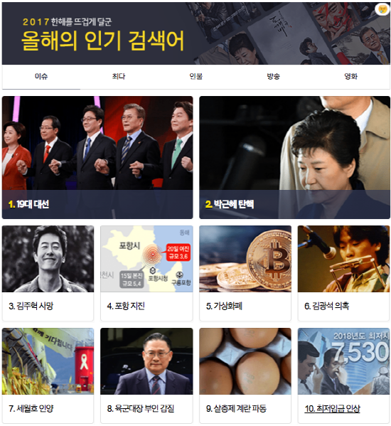 2017년 ‘이슈’ 중 가장 많은 관심을 모은 검색어는 ‘19대 대선’이었다. 2위는 ‘박근혜 탄핵’, 3위는 ‘김주혁 사망’, 4위는 ‘포항 지진’, 5위는 ‘가상화폐' 등으로 나타났다. 6위는 ‘김광석 의혹’, 7위 ‘세월호 인양’, 8위 '육군대장 부인 갑질’, 9위 ‘살충제 계란 파동’, 10위 ‘최저 임금 인상’ 등이 뒤를 이었다.