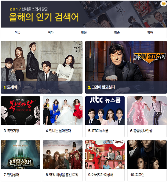 가장 많이 찾은 ‘방송’ 프로그램으로는 tvN에서 방영한 ‘도깨비’가 1위를 기록했다. 도깨비 외에도 4위 '언니는 살아있다(SBS)', 6위 ‘황금빛 내인생(KBS)’, 8위 ‘역적 백성을 훔친 도적(MBC)’ 등 드라마들이 상위권을 차지했다. 이 밖에도 ‘그것이 알고 싶다(SBS)’가 2위, ‘JTBC 뉴스룸’이 5위로 나타났다. 예능 프로그램으로는 ‘복면가왕(MBC)’이 3위, ‘팬텀싱어(JTBC)’가 7위를 기록했다.