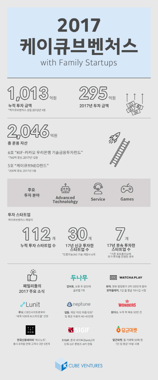 케이큐브벤처스(공동대표 유승운, 신민균)가 2017년 투자 성과가 담긴 인포그래픽을 만들어 발표했다.