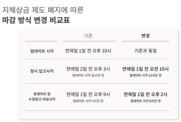 첫째로, 지난해 11월 발표한 대로 지체상금이 폐지되고 마감시각이 변경된다. 계약상 명시되어 있는 지체상금 조항은 2월부터 순차적인 변경합의서 체결을 통해 사라지게 된다. 회사측은 정시마감시각은 기존 업데이트 31시간 전에서 12시간 전으로, 휴재 및 수정원고 마감시각은 업데이트 1시간 전에서 8시간 전으로 변경되는 안을 제안했다. 정시마감 시각은 19시간 미루고 휴재 및 수정원고 마감시각은 7시간 당기는 안이다.