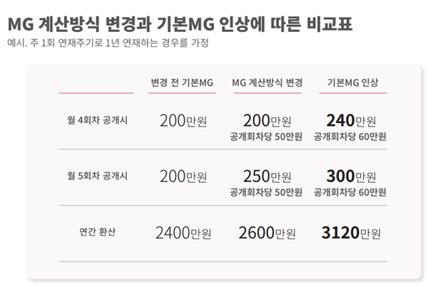 금번 안은 기본MG를 기존 월200만원에서 월240만원(주1회 연재 기준 회차당 기준금액 60만원)으로 인상하는 내용이다. 기존에 월MG 200만원을 초과하는 MG계약을 한 경우도 최소 월240만원의 MG는 적용하며 최종인상폭은 개별 협의를 거치게 될 예정이다.