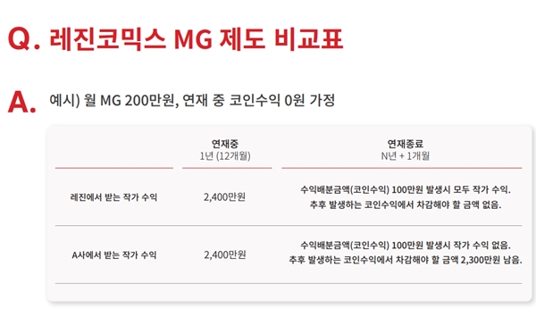 둘째, MG 계산방식이 변경되고 공개회차당 금액이 인상된다. 레진코믹스는 포털과 달리 유료 콘텐츠판매 이외에는 별도의 광고나 수익모델이 없어, 해당작품이 팔리는 만큼 정산하는 수익모델로 운영 중이다. 레진코믹스 MG는 연재중인 작품의 판매정산액이 월 200만원이 안되면 200만원까지는 회사가 이를 보장해주는 제도를 운영 중이다. 예를 들어 해당월 작가에게 지급하는 판매정산액이 700만원이면 700만원을, 40만원이면 160만원을 더해 200만원을, 200만원이면 200만원을 정산하는 방식이다. 회사가 매월 얼마의 MG를 보존했든 차후에 이를 차감하지 않는다.