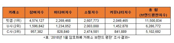 한국 최고 암호화폐(가상화폐) 거래소 빗썸이 브랜드 평판 조사에서 타 거래소를 제치고 정상에 올랐다.