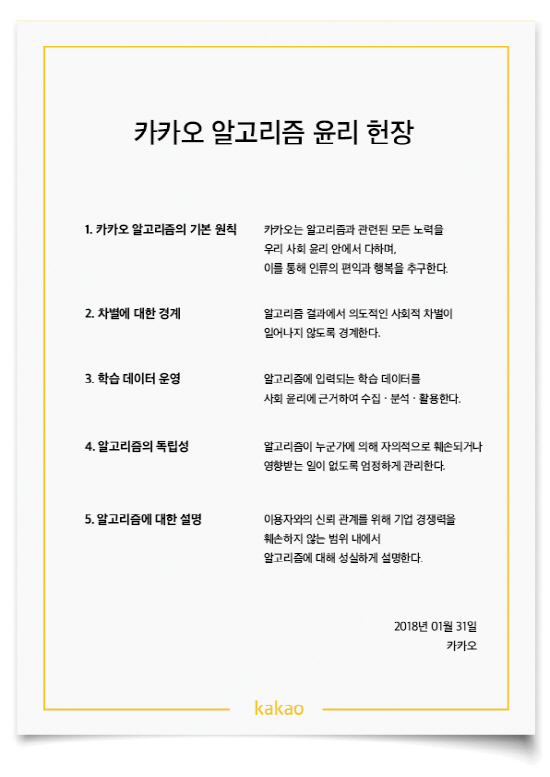 카카오 알고리즘 윤리 헌장에는 인류의 편익과 행복을 추구하는 카카오 AI 기술의 지향점, 결과의 의도적 차별성 방지, 윤리에 근거한 학습 데이터 및 수집 관리 원칙 등이 담겨 있다. 알고리즘 관리의 독립성과 알고리즘에 대한 설명 방침도 포함돼 있다.