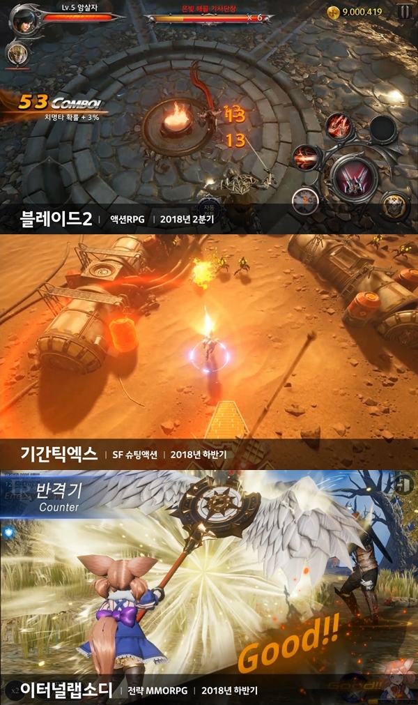 이 중 액션스퀘어의 게임 3종 ‘블레이드2’, ‘기간틱엑스’, ‘이터널랩소디’는 카카오게임즈가 별도의 액션스퀘어 카테고리를 만들어 소개할만큼 공을 들였다. ‘블레이드2’는 강렬한 타격감과 콘솔 게임 수준의 화려한 그래픽을 자랑하는 액션RPG로, 2018년 2분기에 출시된다. ‘기간틱엑스’는 3인칭 쿼터뷰 시점의 SF 슈팅게임이며, ‘이터널랩소디’는 수집형 RPG에 MMORPG를 결합한 전략 MMORPG다.