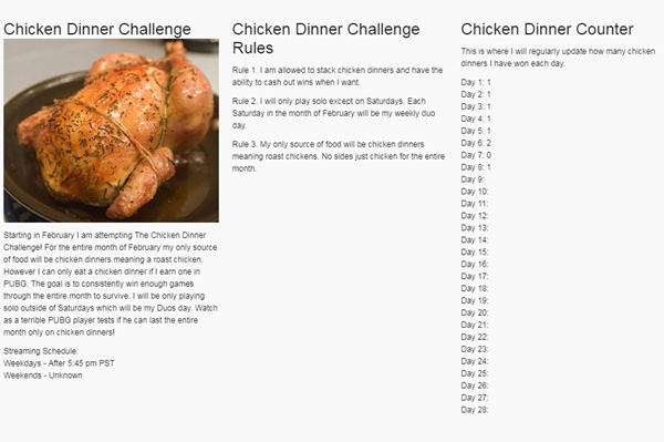 최근 유명 콘텐츠 크리에이터 앤드류 팬톤(Andrew Panton)은 트위치를 통해 2월 한달 동안 ‘치킨 디너 챌린지’를 진행한다고 밝혔다. 팬톤은 비디오게임 전문 커뮤니티 어치브먼트헌터(AchievementHunter) 창작팀 소속이다. 어치브먼트헌터는 유튜브에서 ‘어치브먼트헌터’, ‘렛츠플레이’ 등의 유튜브 채널을 운영하고 있으며, 이 채널들의 구독자수 총합은 500만명, 조회수 총합은 20억뷰에 달한다.