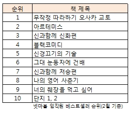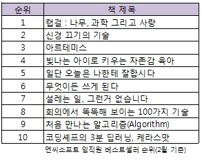 2위는 자기계발서 ‘신경 끄기의 기술’이다. 미국에서 가장 영향력 있는 파워블로거인 마크 맨슨은 이 책에서 때론 내려놓고 포기할 줄 알아야 인생에서 중요한 것들을 발견할 수 있다고 강조한다. 3위는 넷마블에서도 2위를 차지한 바 있는 ‘아르테미스’다.