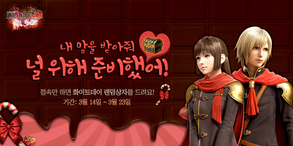 또 오는 23일까지 매일 게임에 접속하는 유저들에게는 화이트데이 선물세트 상자를 1개씩 획득할 수 있는 자격이 주어지며, 이벤트 기간 10일 중 최대 8일까지 자격을 획득할 수 있다. 이벤트 보상은 오는 27일 접속 횟수를 산출해 일괄 지급할 예정이다.