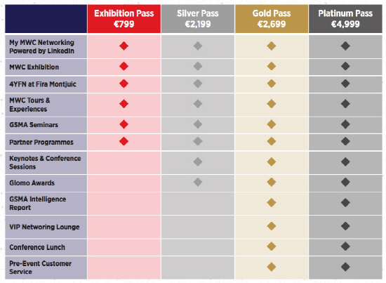 MWC 바르셀로나라고 해서 모든 것이 완벽하지는 않다. 일단 입장료가 너무 비싸다. 제일 저렴한 일반인 입장권이 약 105만원(799유로)이며, 가장 비싼 입장권은 약 650만원(4,999유로) 정도 한다. 입장권의 종류에 따라 입장 할 수 있는 공간들이 다소 다르다. 기업 차원에서 참석하는 것이 아니라면 일반인들은 개인돈으로 참석하기 힘든 행사다.