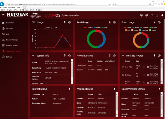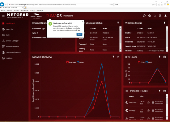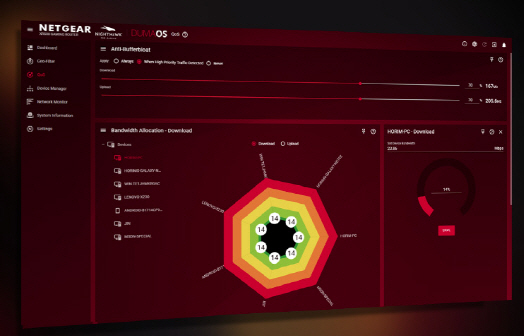 관리 프로그램은 일반적인 공유기 프로그램에 비해 화려하면서도 게임에 필요한 기능 위주로 최적화되어 있다. 각 카테고리에 들어가면 현황이 대시보드 형식으로 표시된다. 여기서 마우스를 통해 필요한 관리를 세팅할 수 있다. 적색톤으로 된 바탕화면은 묵직하면서도 강렬한 느낌을 준다.
