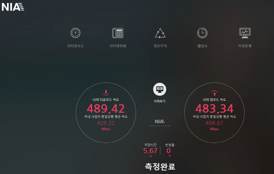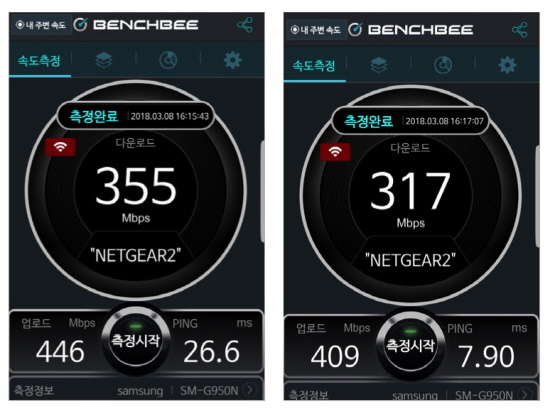 이번에는 3미터 떨어진 밀폐된 방에서 측정했다. 오른쪽이 그 결과인데 다운로드는 317Mbps로 약간 줄고 업로드 역시 409Mbps로 약간 줄어들었다. 그렇지만 지연시간은 7.90ms로 오히려 더 좋아졌다. 장거리에서도 안정적인 전달능력을 가지고 있다는 것을 알 수 있다.