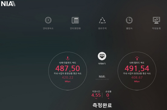 이 제품의 실제 성능을 측정해보았다. 인터넷 공급자에서 온 원회선은 500메가 제한이 걸려있는 KT 기가 컴팩트 서비스이다. 여기에 넷기어 XR500를 연결한 상태에서 측정했다. 다운로드 속도와 업로드 속도 모두 최대속도와 거의 같다. 업로드 지연속도를 뜻하는 핑값도 상당히 작게 나와 안정적 전달력을 확인할 수 있다.