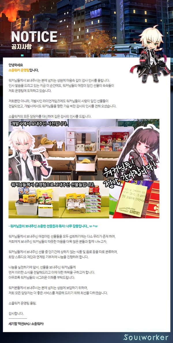 소식을 들은 다른 게임 유저들과 게임업계 종사자들까지 찾아오면서 기부 행렬은 계속 이어지고 있다. 한 유저는 “소울워커 덕분에 난생 처음 기부를 해본다”며 “적은 금액이지만 도움이 됐으면 좋겠다”고 전했다.