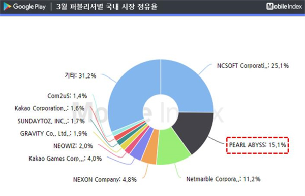 아이지에이웍스는 16일 모바일인덱스 분석 리포트를 통해 “3월 퍼블리셔 국내 시장 점유율에서 펄어비스가 약 15%를 차지하며 퍼블리셔 국내 매출 2위를 차지했다”고 밝혔다. 기존에는 넷마블(11.2%)과 넥슨(4.8%)이 2위와 3위 자리를 차지하고 있었다.